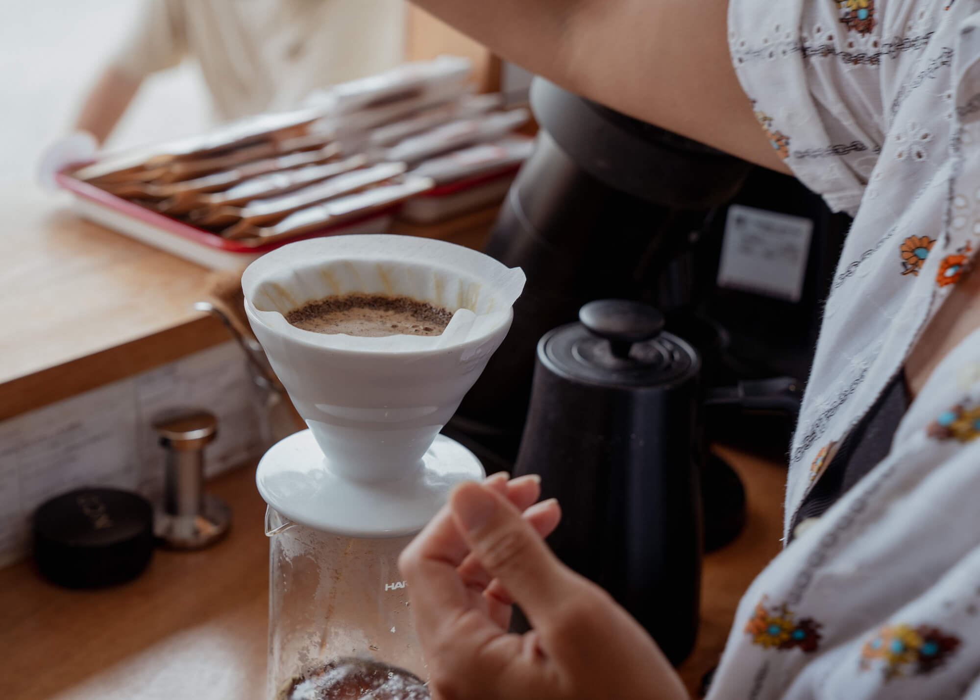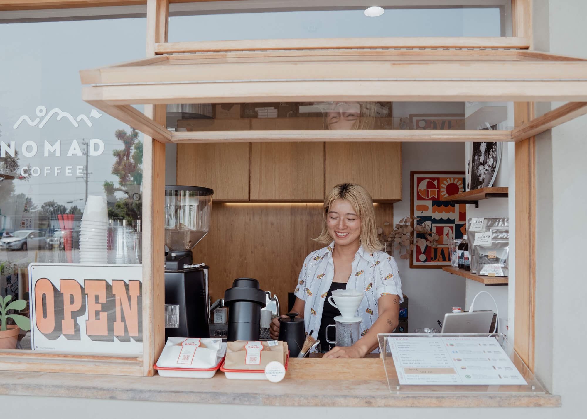 浜名湖のほとりにあるコーヒーショップ〈NOMAD COFFEE〉のCOO、バリスタを務める豊田奈菜さん。自家焙煎コーヒー豆の購入やハンドドリップコーヒー、ラテを提供しているこのお店をプロデュースするのは、ヨガ・瞑想指導者のバンライファーの西川順喜さんだ。豊かさを求めて旅をする遊牧民のように、コーヒー1杯で“豊かさ”を感じられるようにと、“NOMAD(ノマド)”と名付けられた。そんなお店の一員である豊田さんは、中学生の息子を持つシングルマザー。地元浜松から上京後、子育て期間も含め長らく東京で暮らしたが新型コロナウイルスの流行をきっかけに、生まれ育った町へ帰ってきた。潮風が漂う地元で、長年やってみたかったサーフィンをはじめ、自然体でユニークな仲間もできた。ライフスタイルの変化によって“こわばっていたところがほぐれたんです”と笑う。