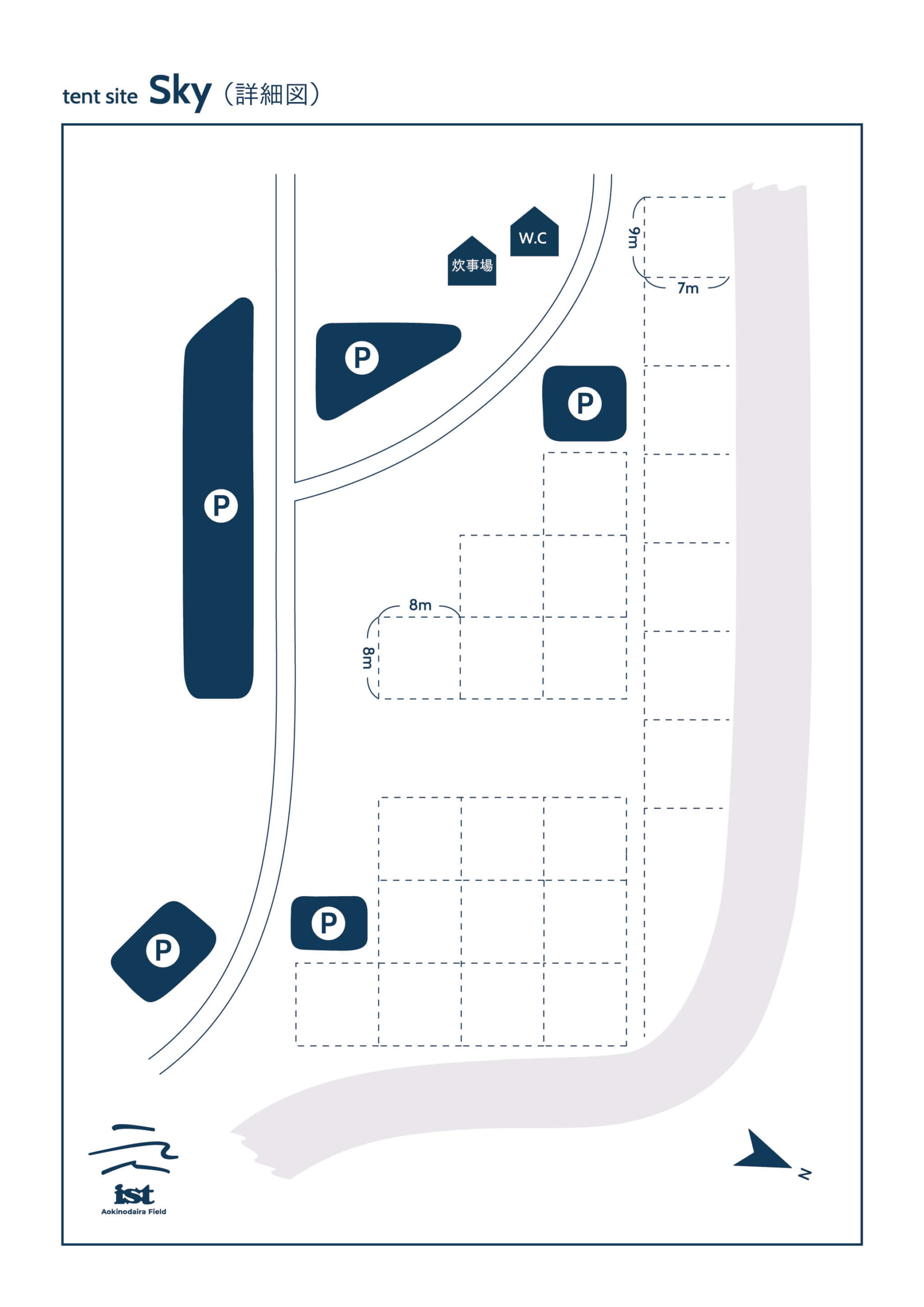 約70,000平米の広大な土地に、林間、川沿い、広場、池の畔、線路沿い、直火サイトなど地形の特徴を活かした10種類ほどの個性豊かなテントサイトが点在している「ist-Aokinodaira」。場所によって景色が違うのはもちろん、楽しみ方もそれぞれにあります。その時その場所だけの風景を探して思い思いの時間をお過ごしください。