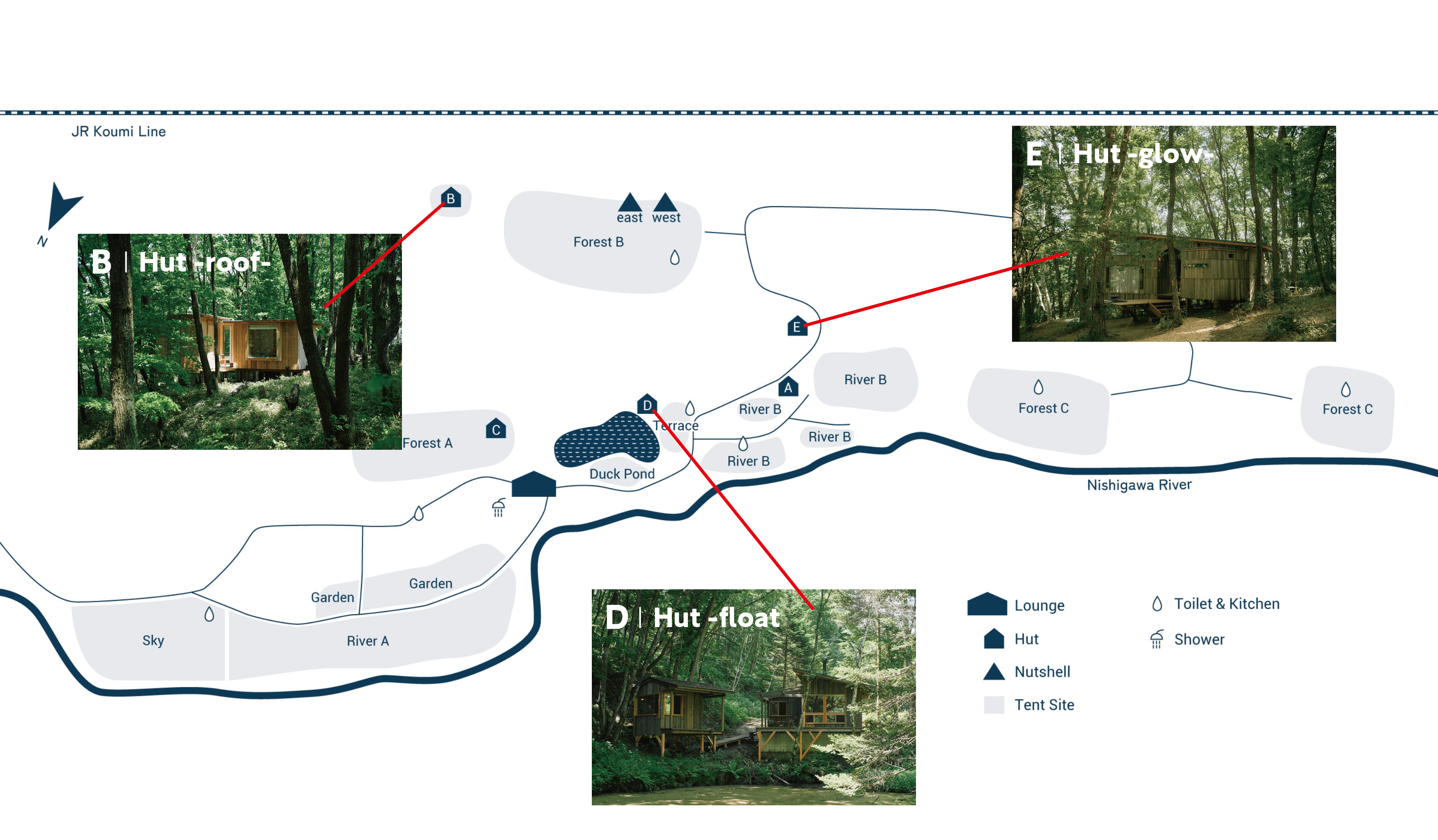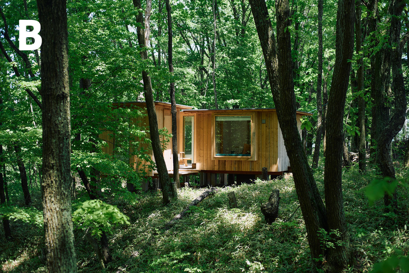 Hut(ハット)と呼ばれる“暮らしの本質が詰まった小さな家”。限られた空間でありながら、心地よく滞在できるように随所にはさまざまな工夫が込められています。地形や風景に合わせてつくられ、場内に点在する5棟のHut。そのうち3棟、「Hut -roof-」「Hut – float -」「Hut -glow-」を本イベント参加者にご提供可能です。景色も、仕様も異なり、それぞれ違った魅力を持つ小さな家から、自然が織りなす風景や季節の移り変わりをぜひお楽しみください。