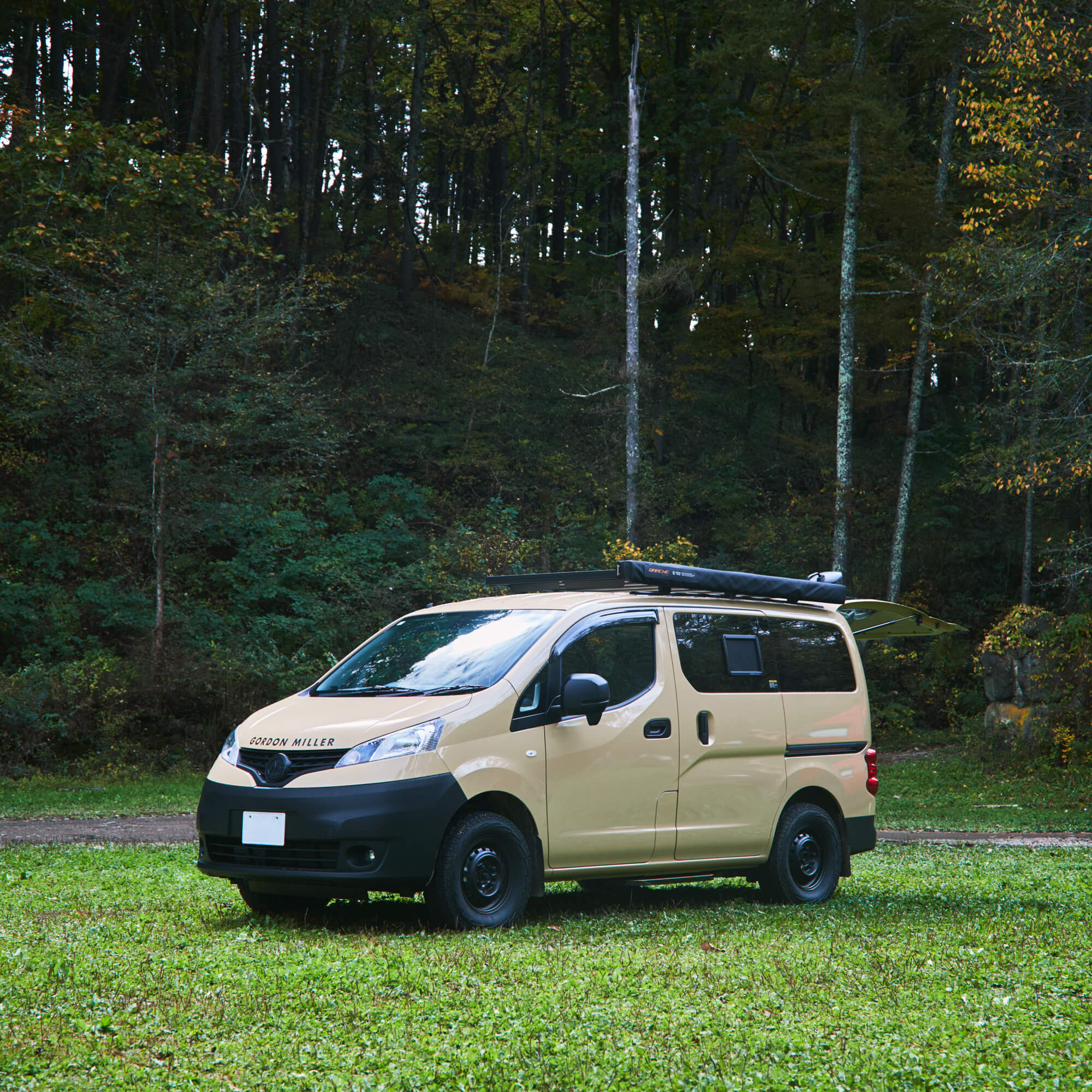 ガレージライフスタイルブランド〈GORDON MILLER〉の車両レーベルである〈GORDON MILLER MOTORS〉が販売する『GMLVAN C-01』。ベースは日産・NV200バネット。ハイエースよりもひとまわり小さいため、見通しもよく乗用車に近い運転感覚なので街中でも快適なドライブが可能です。フレキシブルな車内構造や天然のウッドの内装を備えており、軽いフットワークのまま自分らしいバンライフを実現できます。