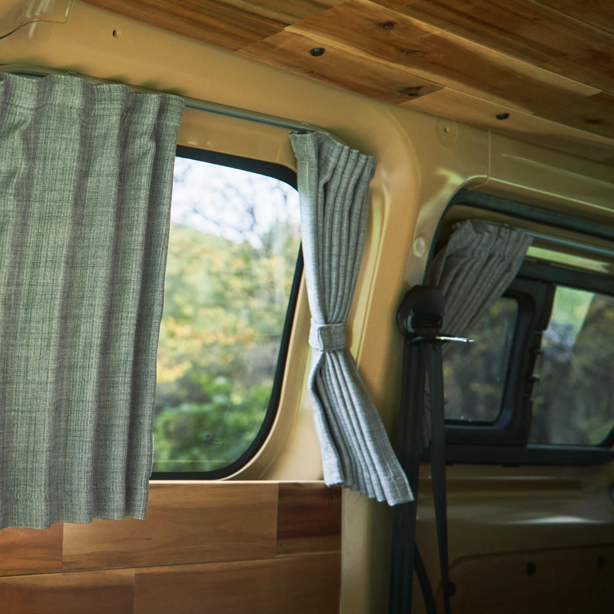 内装は、天然木のアカシア(ホワイトウォールナット)が使用されたログハウスのような空間。天然木で覆われた天井には調光機能付きの暖色LEDライトを採用。車中泊に欠かせないカーテンも装備装備し、セカンドシートはキャンピングカーで主に使用されるREVOシートを。〈GORDON MILLER〉らしいオリジナルボディーカラーは、オリーブドラブとコヨーテから選択が可能。