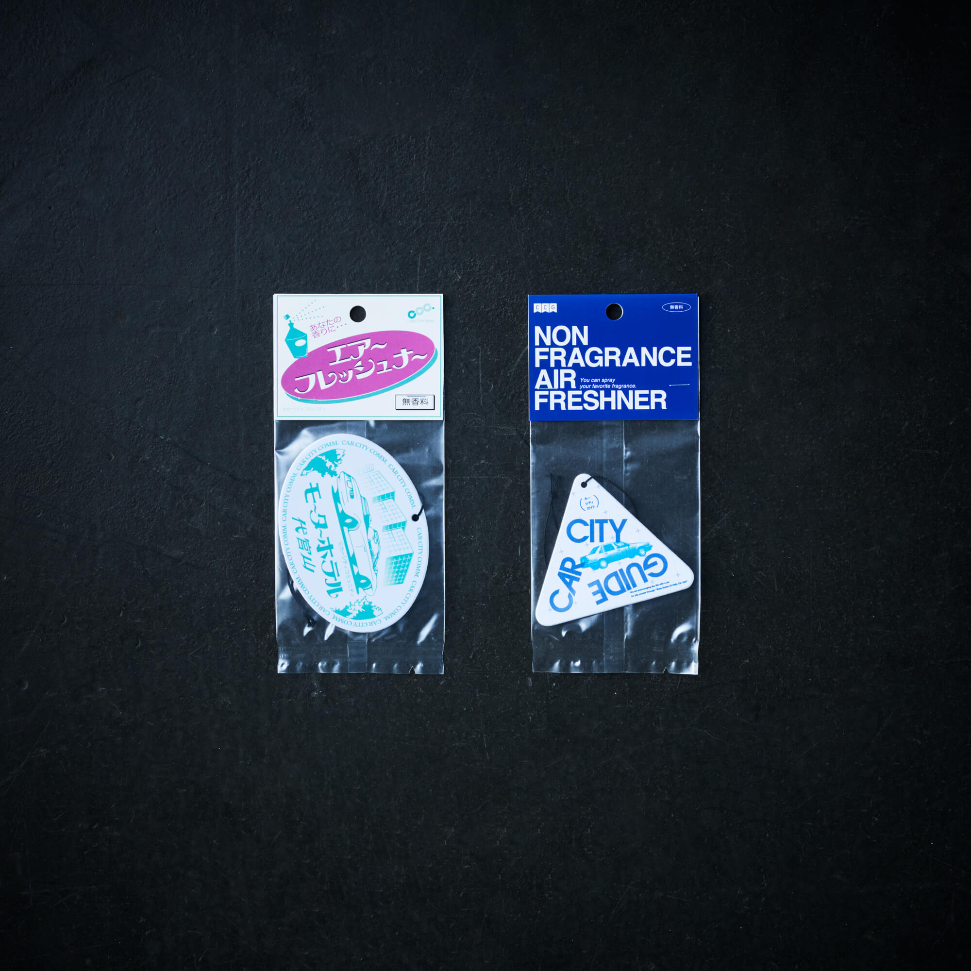 同じくカーメディア〈Car City Guide〉のグッズラインから、ルームミラーに吊るすだけで、車内が少しだけ“旅の部屋”に変わるエアフレッシュナー。香りは敢えての無臭タイプ。つまり、自分の好きな匂いを香り付けできる仕様で、グラフィックは移動のムードを高めてくれるデザイン。